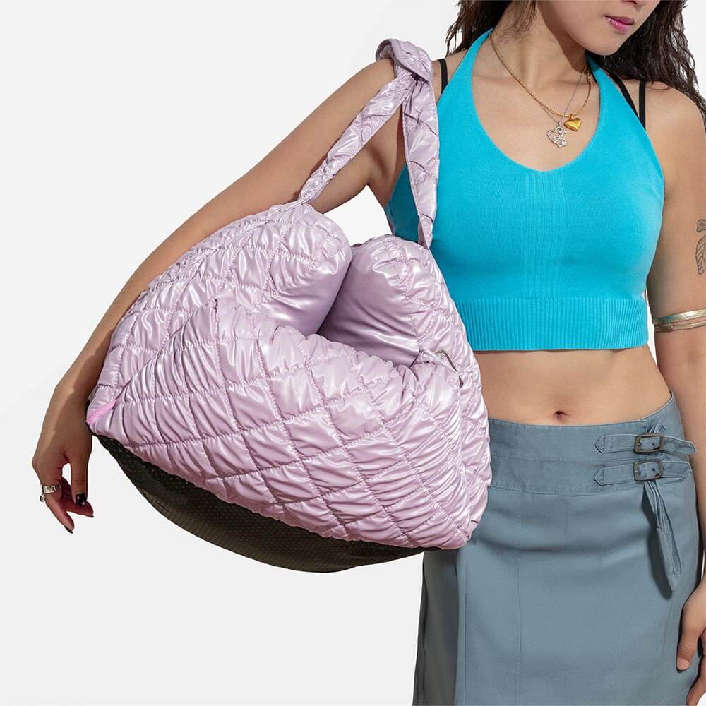 Featuring a sleek, quilted glossy surface with a cloud-like appearance, this pet carrier bag is perfect for pet owners who value both elegance and practicality on the go.